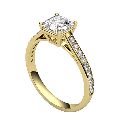 Ring solitaire trionfo yellow gold for asscher-shaped diamond, half diamond band, 4 prongs.
