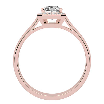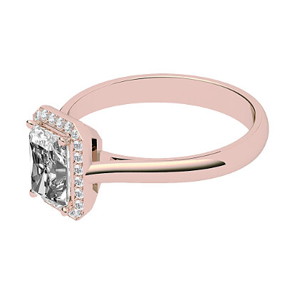 Ring solitaire halo vittoria pink gold for radiant-shaped diamond, classic band, 4 prongs.