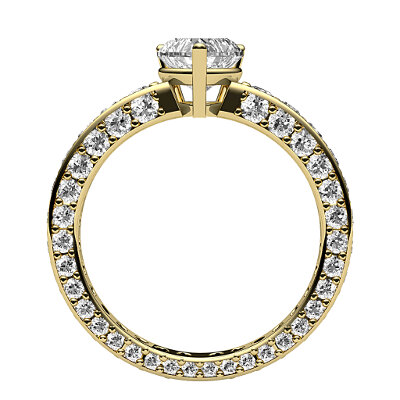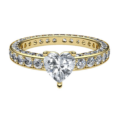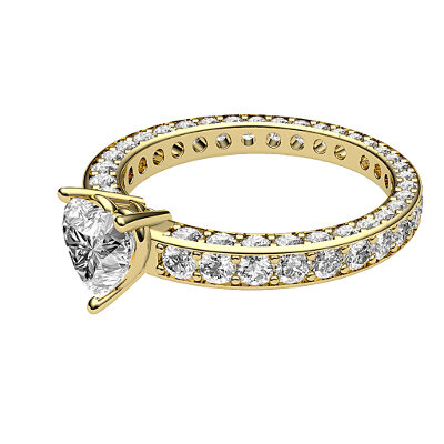 Ring solitaire yellow gold for heart-shaped diamond, full coverage diamond band, 3 prongs.
