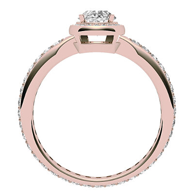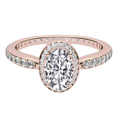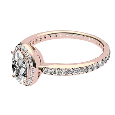 Ring solitaire halo pink gold for oval-shaped diamond, full diamond band, 4 prongs.