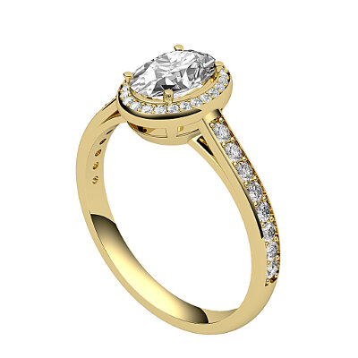 Ring solitaire halo trionfo yellow gold for oval-shaped diamond, half diamond band, 4 prongs.