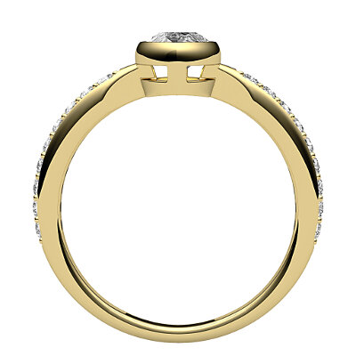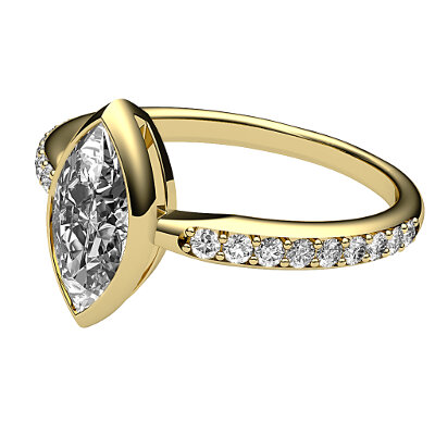 Ring solitaire yellow gold for marquise-shaped diamond, half diamond band, bezel .