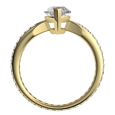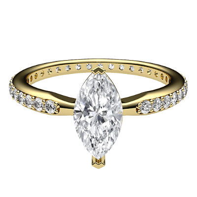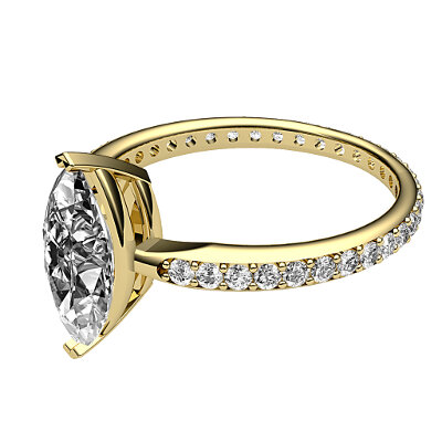 Ring solitaire yellow gold for marquise-shaped diamond, full diamond band, 2 prongs.