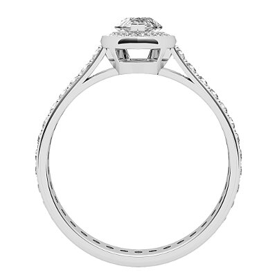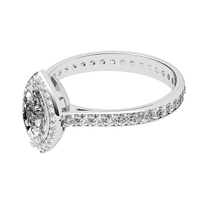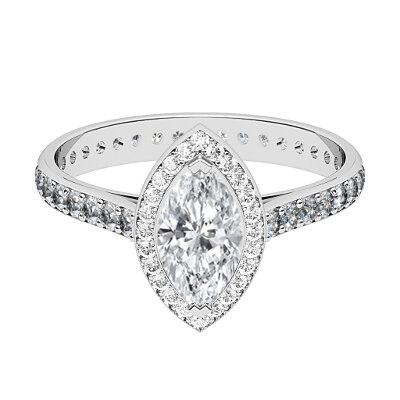 Ring solitaire halo vittoria platinum for marquise-shaped diamond, full diamond band, 2 prongs.