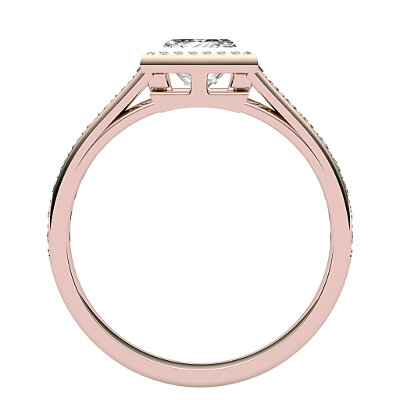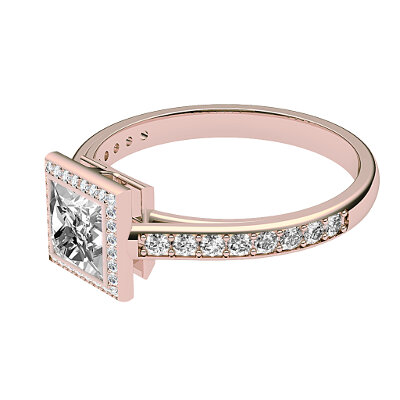Ring solitaire halo trionfo pink gold for princess-shaped diamond, half diamond band, bezel .